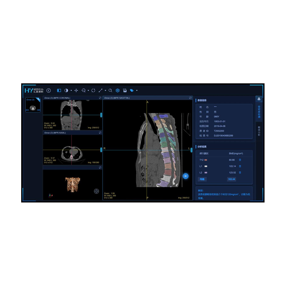 定量 CT 骨科輔助診斷系統(tǒng)定量 CT 骨科輔助診斷系統(tǒng)使用人工智能技術(shù),基于高質(zhì)的 CT 胸部平掃影像數(shù)據(jù),實(shí)現(xiàn)快速分割脊柱各錐體形態(tài),自動(dòng)計(jì)算錐體(L1、L2、T12)的骨密度,自動(dòng)分析錐體畸形程度,診斷錐體骨折,并根據(jù)中國(guó)定量 CT 骨質(zhì)疏松診斷指南給出結(jié)論,輔助臨床進(jìn)行骨質(zhì)疏松疾病的診斷。